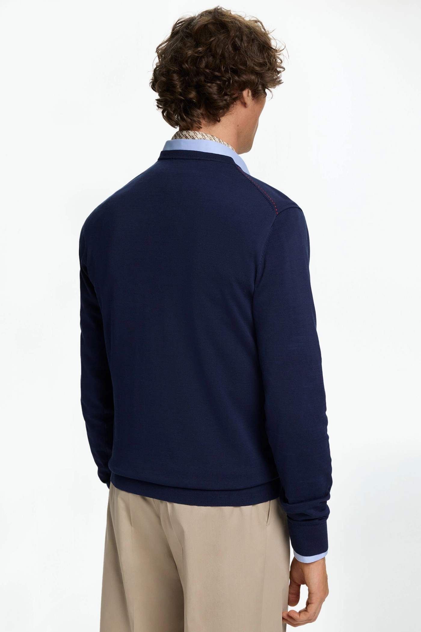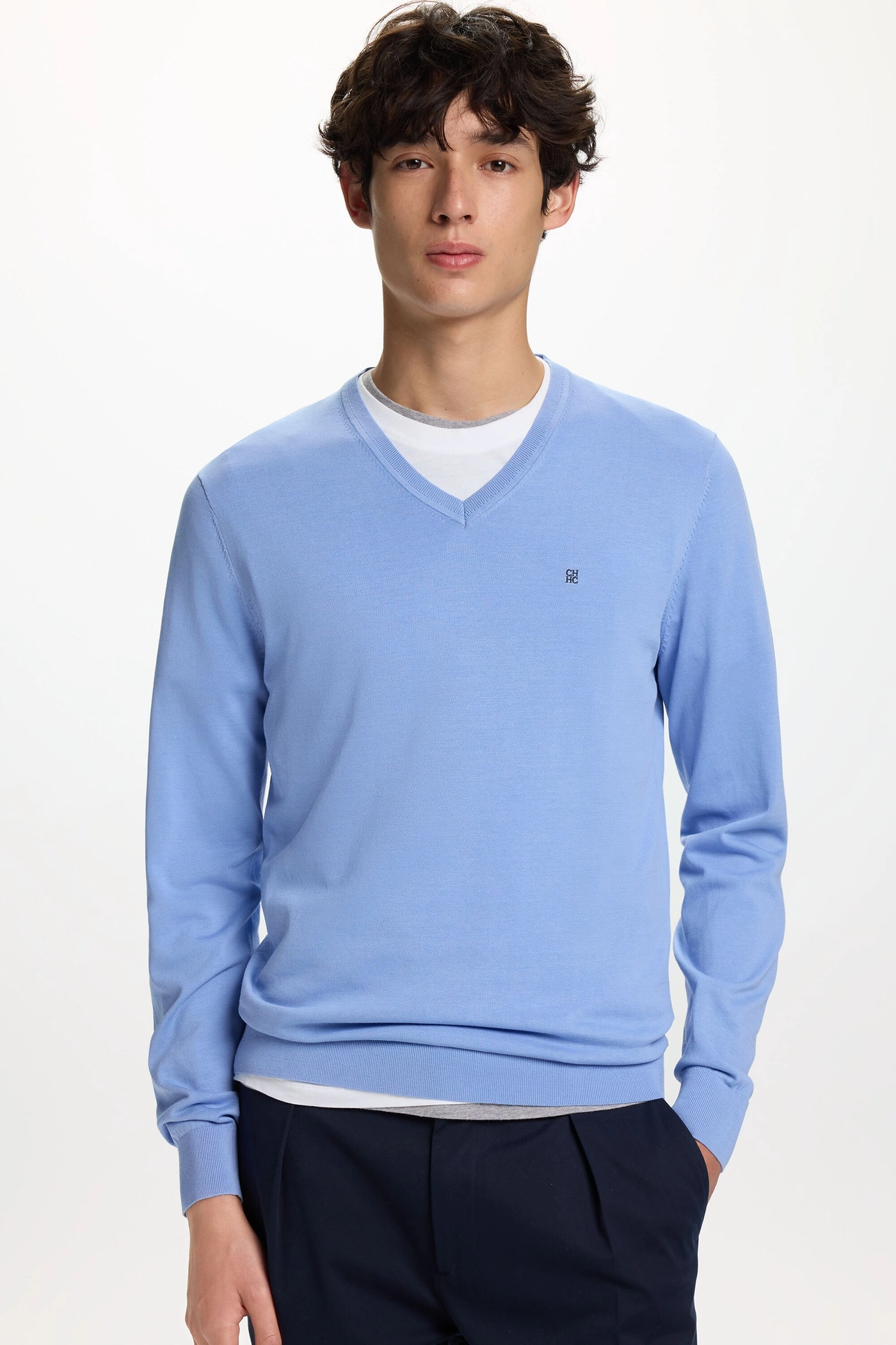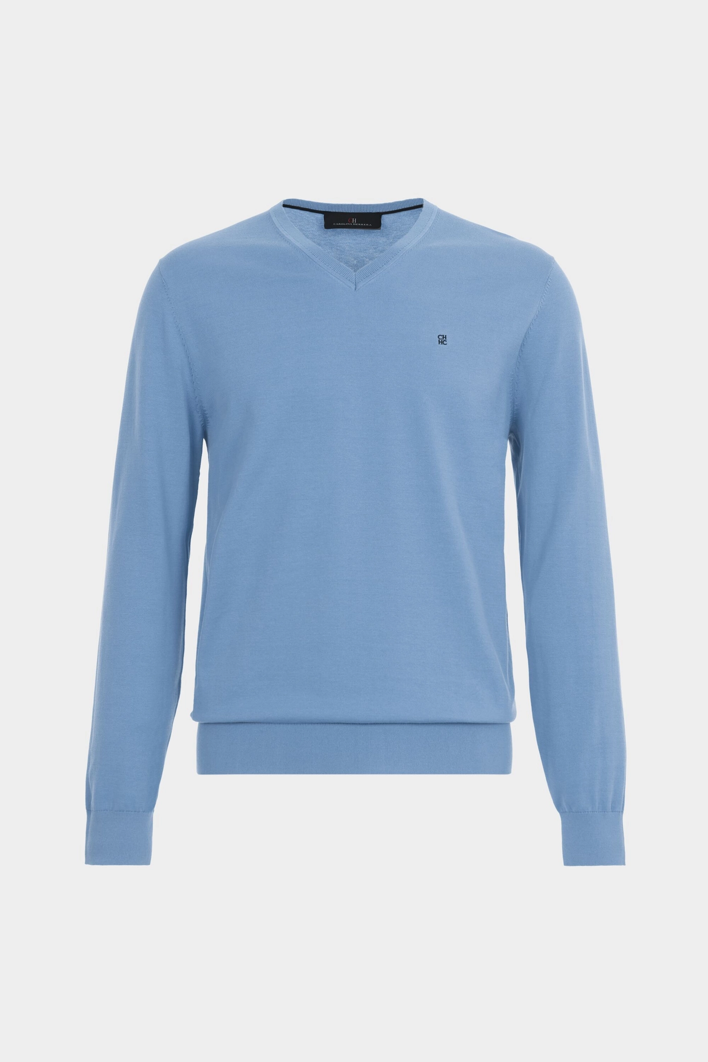 Regular fit sweater in gassed cotton plain knit with V-neck and contrasting shoulder stitching. Carolina’s contrasting initials embroidered at the chest.